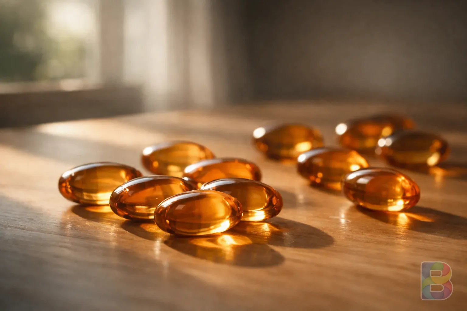 photorealistic, high-detail macro shot of a single golden oil capsule reflecting light, clean clinical background, warm tones, cinematic lighting