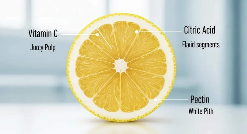 레몬 특유의 날카로운 신맛을 내는 구연산(Citric Acid)과 껍질 안쪽의 하얀 부분에 존재하는 펙틴(Pectin), 그리고 풍부한 칼륨이 복합적으로 작용하여 체내 대사를 조절합니다.
